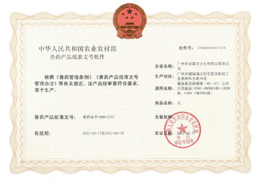 獸藥生產(chǎn)許可證:(2022)獸藥生產(chǎn)證字19091字