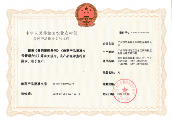 獸藥生產許可證:(2022)獸藥生產證字19091字