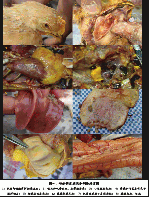 剖檢可見喉頭、氣管粘膜充血、出血,氣管內(nèi)充滿粘液,肺臟出血,氣囊渾濁、有黃色干酪樣物質(zhì),心冠脂肪有針尖樣出血,部分雞肝臟略顯腫大、有少量出血點(diǎn),脾臟腫大、部分有白色斑點(diǎn)狀壞死,腎臟腫大、部分有尿酸鹽沉積,盲腸扁桃體腫大,腺胃粘膜充血,肌胃角質(zhì)層下有斑點(diǎn)狀潰瘍,胰腺輕微出血、有白色壞死點(diǎn),腸道黏膜出血。