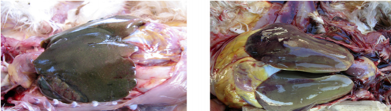 5、禽弧菌性肝炎:肝臟腫大,慢性病例在肝臟的表面和實質內有黃色、星芒狀的小壞死灶或布滿菜花狀的大壞死區,急性病例肝臟被膜脫落肝臟出血,腹腔內有多量血水。