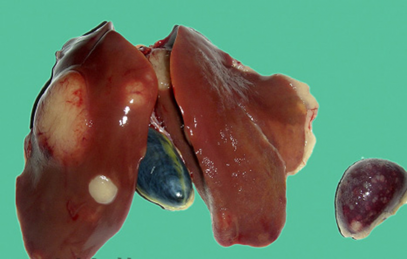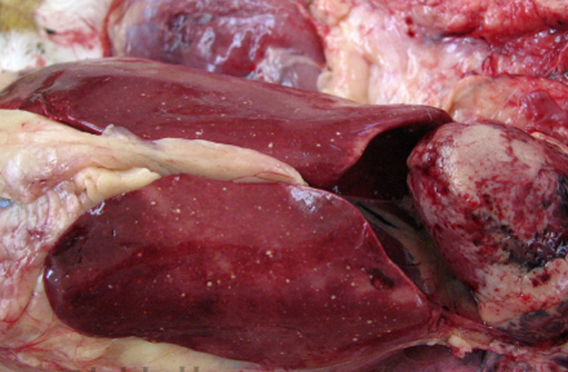 3、禽傷寒:肝臟變成淡綠棕色或古銅綠色,肝臟表面有時有灰白色米粒狀壞死點。